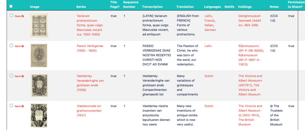 From 2021–2022, with the support of a Faculty Research Fellowship from the Melbern G. Glasscock Center of Humanities Research at Texas A&M University, Uchacz began to collect instances of ornament print series from ca. 1540 to 1620 that are introduced by title pages. With a Technical Assistance Grant from Texas A&M’s Center of Digital Humanities Research (CoDHR) and assistance from Bryan Tarpley, creator of Corpora, a dataset studio for the Digital Humanities, Uchacz and her research assistants Katelyn Noble and Catherine Crawford organized these prints in a relational database, tracking publication info for the prints, creating transcriptions and translations of the texts, and linking the prints to authoritative URIs in the Getty Union List of Artist Names. Additionally, the database tracks the rhetorical devices and addressees (specific artistic professions, collectors) for each of the print series.