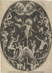 The entrance to Hell portrayed as the gaping mouth of a huge monster.
