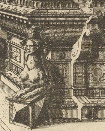 A column taking the form of a sphynx, a mythical creature with the head of a human, the body of a lion, and the wings of an eagle.