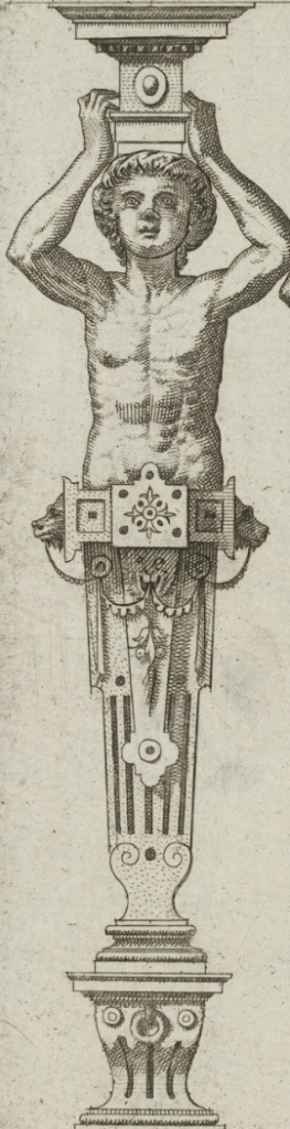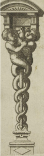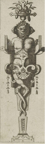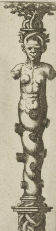 The sculpted figure of a monster or legendary creature with a head, bust, and largely complete torso that extends into a pillar.